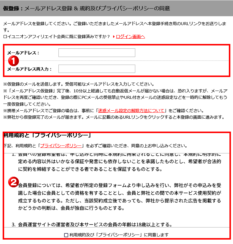 利用規約と「プライバシーポリシー」を確認のうえ「同意します」にチェックを入れて「上記メールアドレスで仮登録する」をクリックします。