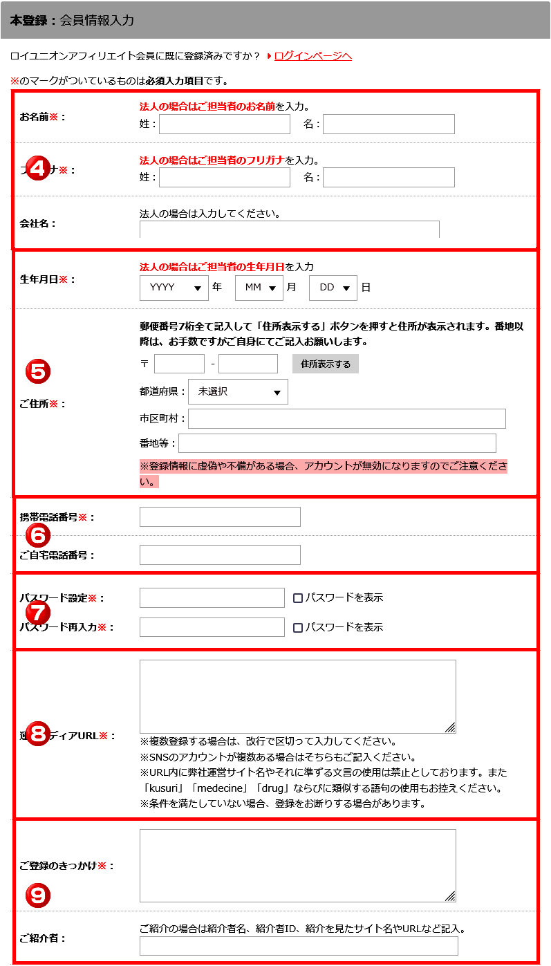 弊社アフィリエイトをご紹介で登録の場合は、紹介者名や紹介者の会員ID、紹介を見たサイト名もしくはURLの入力をお願いたします。