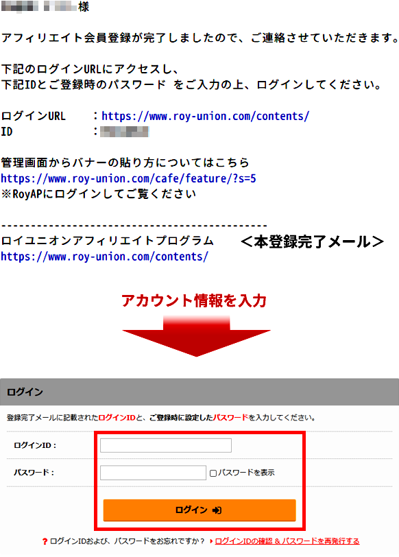 メールに記載のログインIDと本登録時に入力いただいたパスワードにてアフィリエイト管理画面にログインができるようになります。