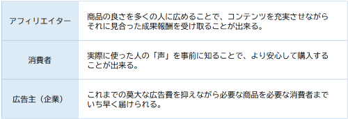 アフィリエイターは自身の視点から発信することで「広告主が思いつかないような新しいアイデア」「消費者目線での広告」を効率的に消費者まで届けることが出来ます。それによって消費者・広告主どちらにもメリットを生み出すこととなり、その結果、三者の需要と供給がマッチする【互恵関係】が成立します。その強い関係性こそがアフィリエイト市場が拡大し続けている要因のひとつと言えるでしょう。